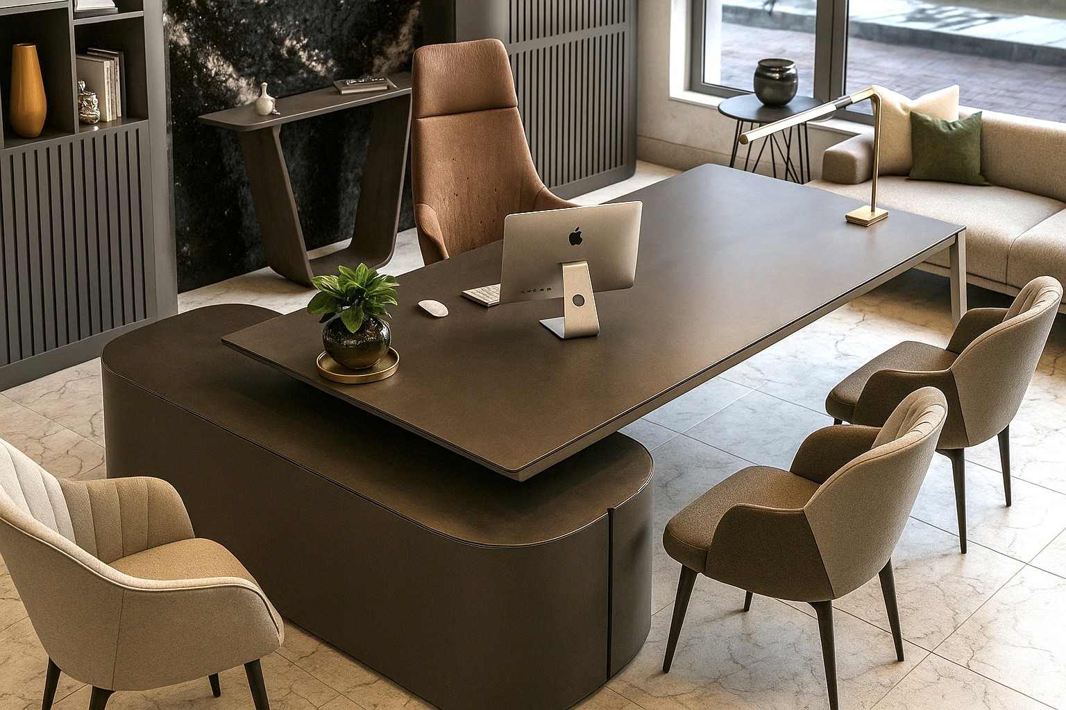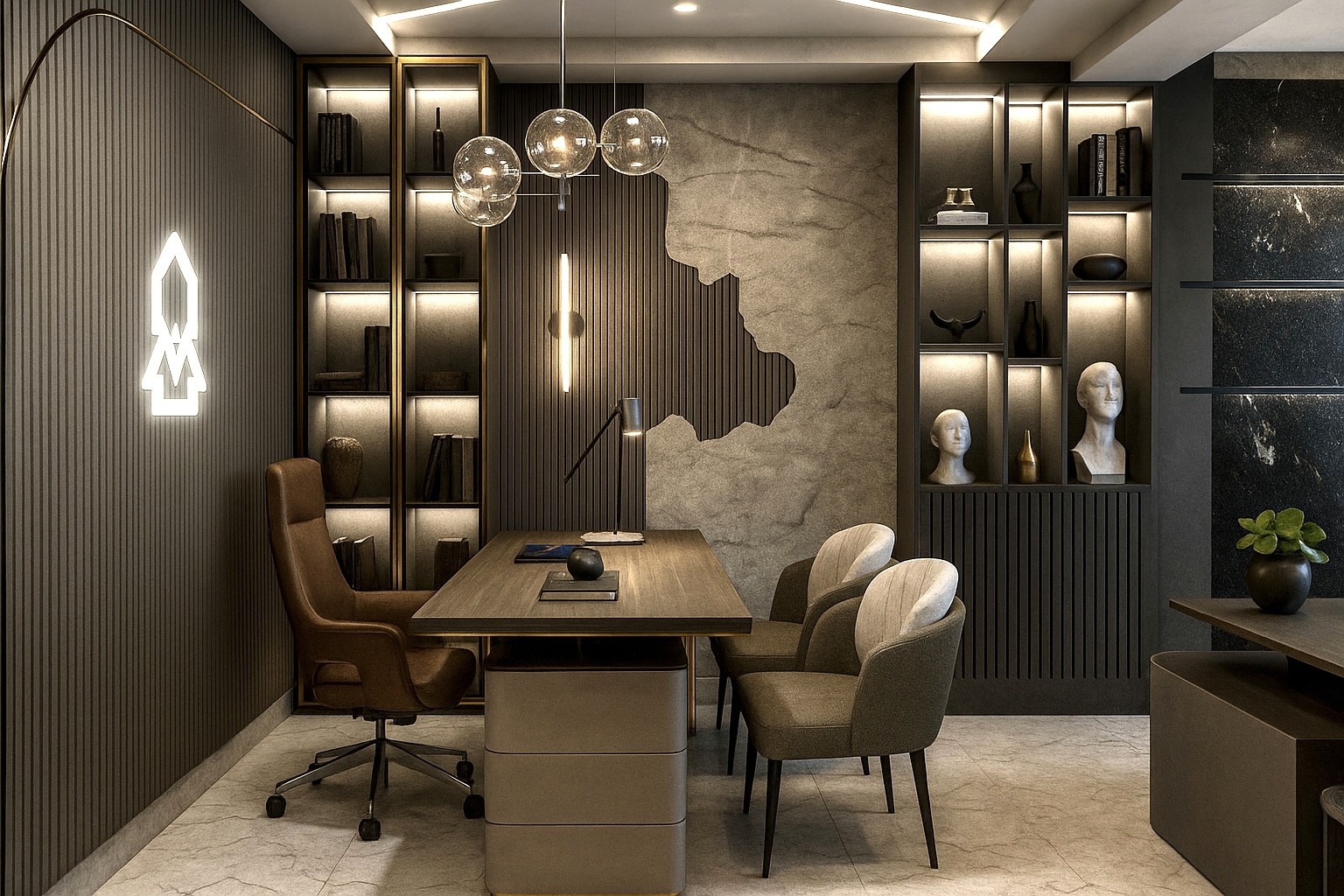This executive workspace perfectly reflects the client’s vision of a modern, warm, and sophisticated environment. The rich wood paneling, soft ambient lighting, and carefully curated décor come together to create a space that feels both professional and inviting. Every detail—from the elegant shelving to the contemporary furnishings—was thoughtfully designed to meet the client’s need for a functional yet impressive setting