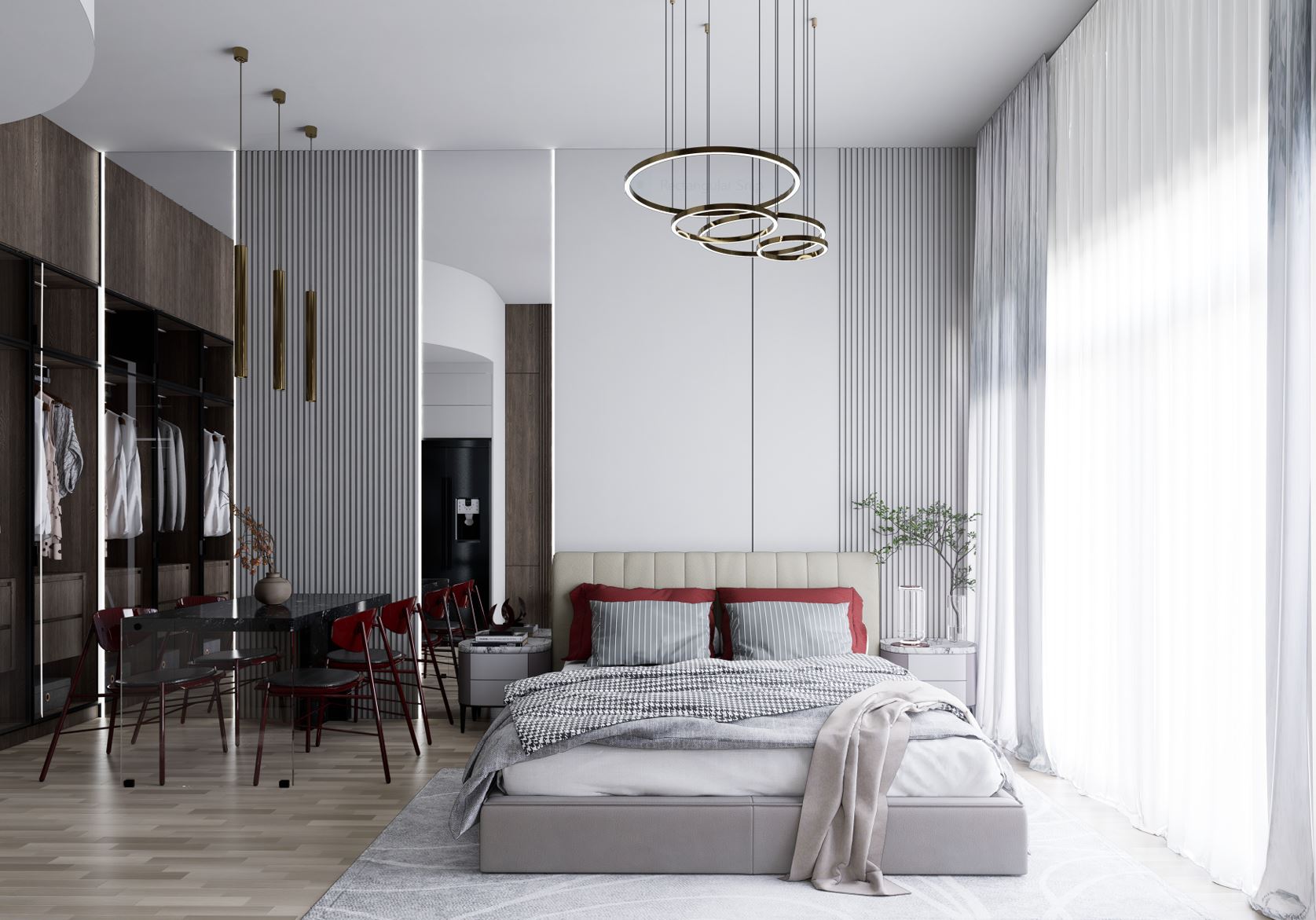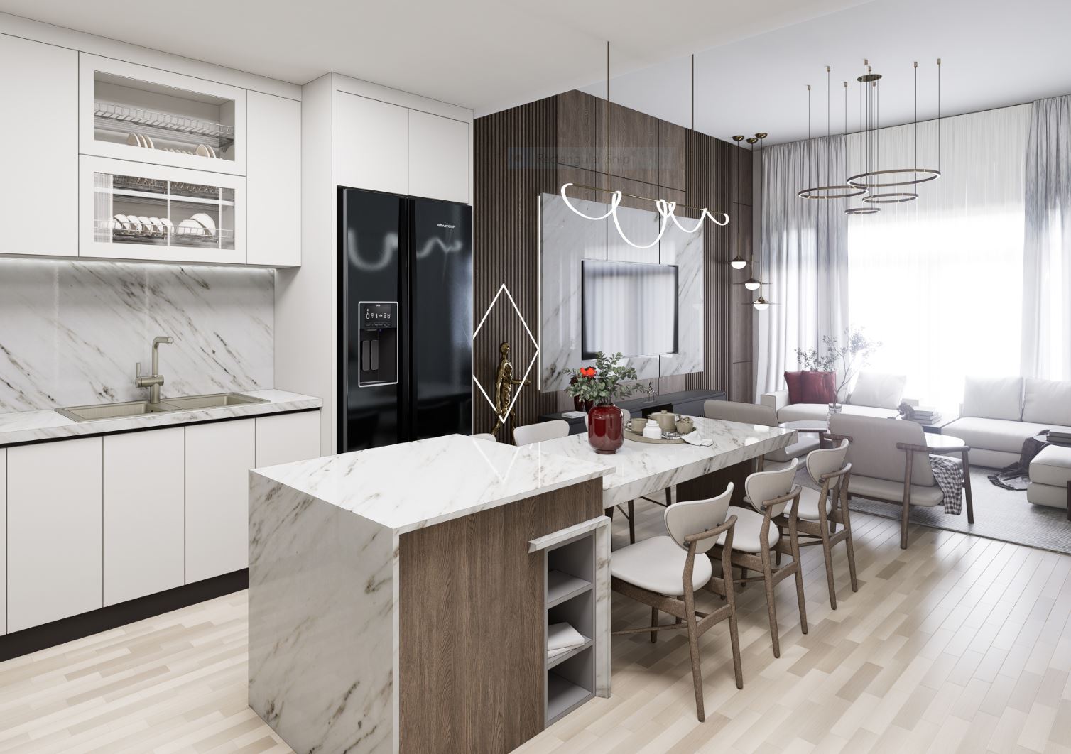 Designed to meet the client’s need for a calm, functional, and elegant living environment, this contemporary interior combines clean lines with a soft, neutral palette. Warm wood, marble surfaces, and subtle red accents create a refined yet inviting atmosphere, while the open layout maximizes space and natural light. Thoughtfully selected materials and sculptural lighting enhance both comfort and sophistication, delivering a cohesive, modern home tailored to everyday living.
